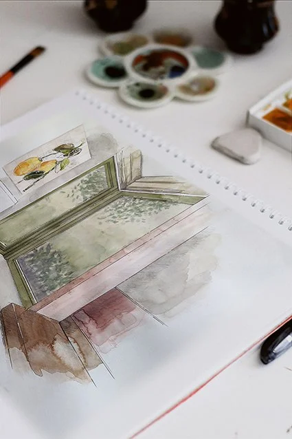 Mijn liefde voor het ambachtelijke zorgt ervoor dat ik graag ook met schetsen en collages werk — niet alles hoeft voor mij op de computer te gebeuren.